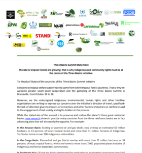 At the closing of the Three Basin Summit on Saturday, governments and leaders vowed to strengthen collaboration to preserve the world’s great rainforest basins but fell short of adopting concrete outcomes to protect tropical forests and forest-dependent communities from the looming threats of industrial and extractive expansion. A reported 3,000 delegates including Heads of States, … Read more
